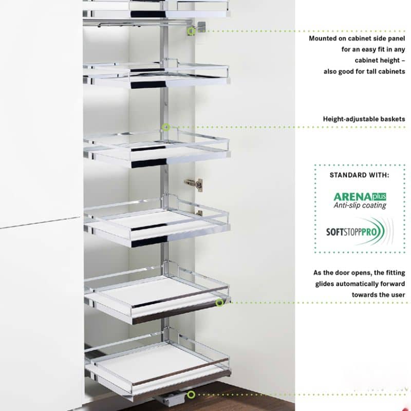- Trọn bộ gồm: thanh ray, khung kéo, bas trước, khay/kệ, kệ gắn cửa, tích hợp bộ giảm chấn SoftStopp